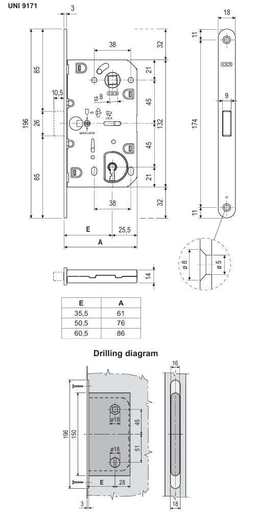 • Minimalistický vzhled: Při otevřených dveřích je střelka zcela zasunuta v těle zámku a nevyčnívá z čela dveří. Hrana dveří tak zůstává zcela hladká a čistá. Díky tomu nehrozí zachycení oblečením ani zranění dětí o ostrou hranu.